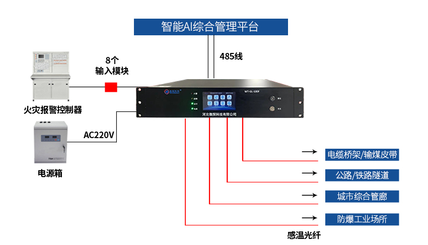 河北微探科技有限公司自主研發(fā)設(shè)計(jì)的WT-GL-100F分布式光纖線型感溫火災(zāi)探測(cè)器,是以GB 16280-2014《線型感溫火災(zāi)探測(cè)器》為設(shè)計(jì)依據(jù),其運(yùn)用OTDR 技術(shù)和 Raman 散射光對(duì)溫度敏銳特性,結(jié)合高頻脈沖激光、波分復(fù)用、高頻信號(hào)采集及微弱信號(hào)處理等技術(shù)來(lái)探測(cè)出光纖不同位置的溫度變化,不僅能穩(wěn)定準(zhǔn)確地預(yù)報(bào)火警,還能準(zhǔn)確定位火情發(fā)生位置。鑒于光纖本身不導(dǎo)電的特性,該產(chǎn)品更適合應(yīng)用于易燃、易爆等危險(xiǎn)區(qū)域和有強(qiáng)電磁干擾、腐蝕、高溫和防爆要求的工業(yè)項(xiàng)目的溫度探測(cè)。