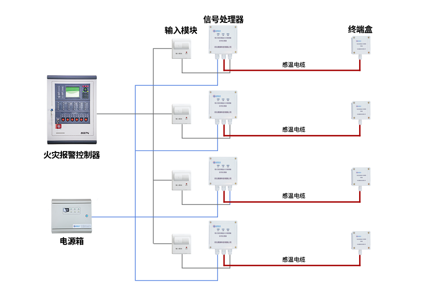 纜式線型感溫火災探測器的信號處理器是用來監(jiān)測感溫電纜阻值變化并與火災報警控制器主機連接的設(shè)備。信號處理器帶有火警、故障繼電器輸出,既可以作為單獨的一個回路也可通過輸入模塊與火災報警控制器主機相連。