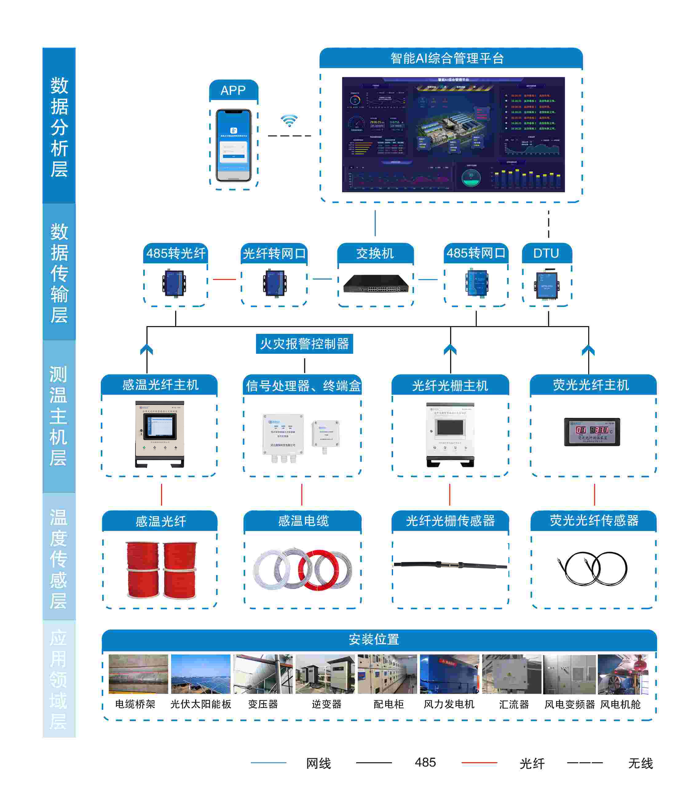 開關柜溫度監(jiān)測系統(tǒng):包括用于監(jiān)測開關柜靜觸頭及母排的智能光纖測溫裝置、用于測量斷路器動觸頭的智能無線測溫裝置,兩者配合使用。通過RS485通訊,將測得的實時數(shù)據(jù)上傳到本公司推出的智能AI綜合管理平臺。并能在溫度異常時及時發(fā)出警報。