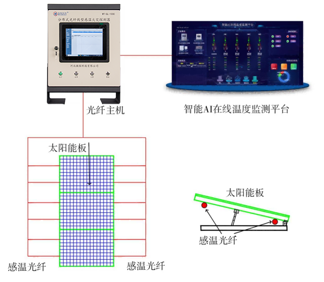 微探科技光伏板溫度監(jiān)測系統(tǒng)由光纖測溫主機、測溫光纖、監(jiān)控管理軟件及相關(guān)輔件組成,它基于OTDR技術(shù)和Raman散射光對溫度敏感的特性沖激光、波分復用、高頻信號采集及微弱信號處理等先進技術(shù),能準確探測光伏板所有易發(fā)熱點,結(jié)合高頻脈的溫度,并識別溫度異常點的具體位置。通過將感溫光纖安裝于光伏板背面,實現(xiàn)分布式的測量。具有實時在線、測溫精度高、不受電磁干擾等優(yōu)點??杉皶r發(fā)現(xiàn)光伏板溫度異常點、潛在缺陷與風險,提高光伏板運維質(zhì)量,輔助電系統(tǒng)運行。