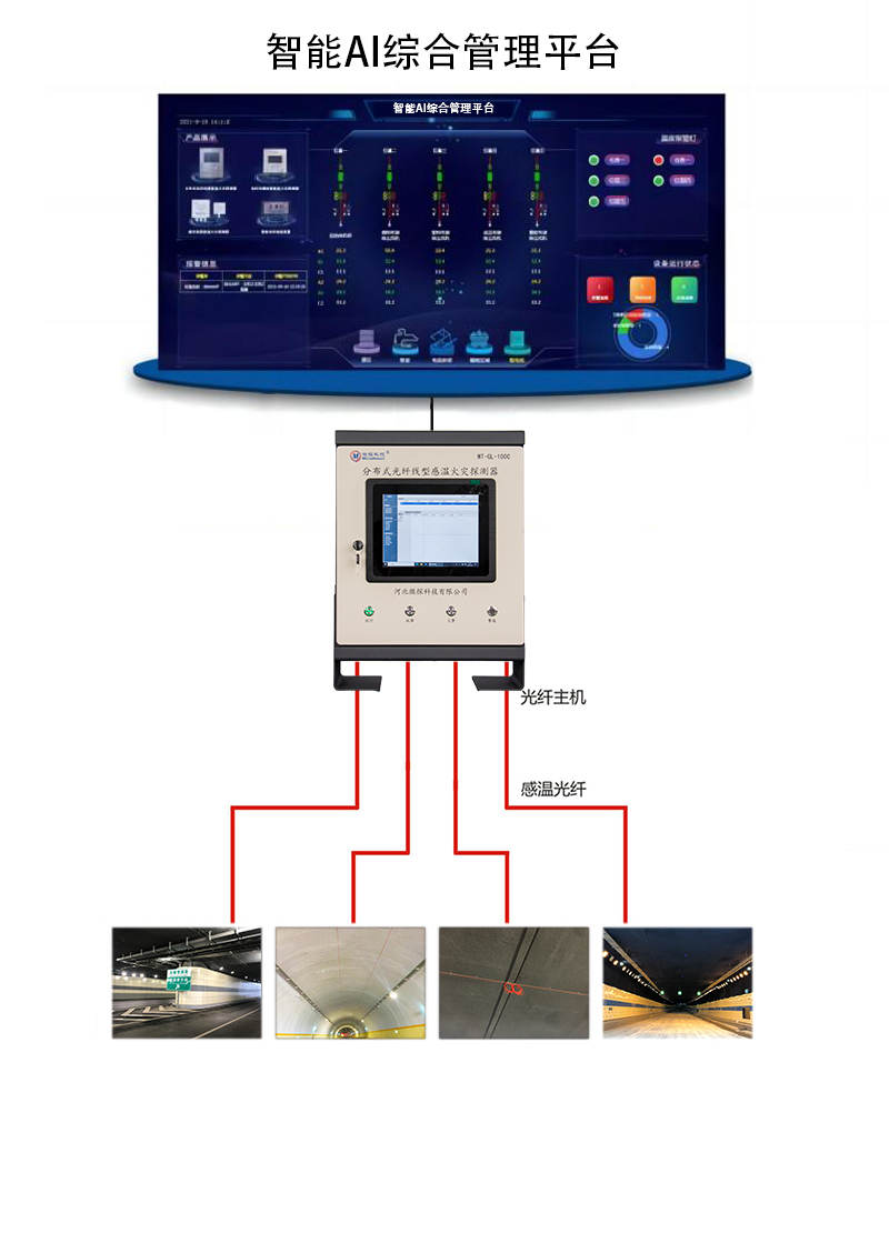 微探科技公路隧道溫度監(jiān)測(cè)方案由光纖測(cè)溫主機(jī)、感溫光纖、監(jiān)控管理軟件及相關(guān)附件組成,它基于OTDR技術(shù)和Raman散射光對(duì)溫度敏感的特性,結(jié)合高頻脈沖激光、波分復(fù)用、高頻信號(hào)采集及微弱信號(hào)處理等技術(shù),將感溫光纖吊裝在隧道頂部,能準(zhǔn)確探測(cè)隧道沿線(xiàn)所有測(cè)量點(diǎn)的溫度,并識(shí)別溫度異常點(diǎn)的具體位置。可實(shí)現(xiàn)幾十公里的溫度連續(xù)測(cè)量,沒(méi)有遺漏點(diǎn)。一旦隧道發(fā)生火災(zāi),系統(tǒng)可捕捉到火情,并將監(jiān)測(cè)的溫度數(shù)據(jù)實(shí)時(shí)上傳到智能AI綜合管理平臺(tái),且可與其他火災(zāi)報(bào)警設(shè)備進(jìn)行聯(lián)動(dòng),保障隧道的運(yùn)行。該系統(tǒng)測(cè)溫距離長(zhǎng),且具有本征無(wú)源、抗電磁干擾、防雷防爆等優(yōu)勢(shì),非常適用于工作空間狹長(zhǎng)、環(huán)境惡劣的隧道區(qū)間。