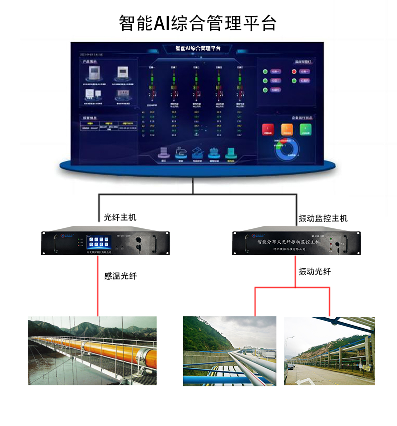 a、由分布式光纖測(cè)溫主機(jī)及相應(yīng)的感溫光纖組成,當(dāng)管道發(fā)生泄漏時(shí),局部的溫度會(huì)發(fā)生變化,光纖主機(jī)通過(guò)對(duì)溫度的監(jiān)測(cè),從而判斷泄漏風(fēng)險(xiǎn),本監(jiān)測(cè)系統(tǒng)可以對(duì)管道的溫度進(jìn)行分布式線(xiàn)型實(shí)時(shí)在線(xiàn)監(jiān)測(cè),并可將測(cè)得的實(shí)時(shí)數(shù)據(jù)上傳到智能AI綜合管理平臺(tái),便于運(yùn)維人員集中管理,減少人力成本投入。