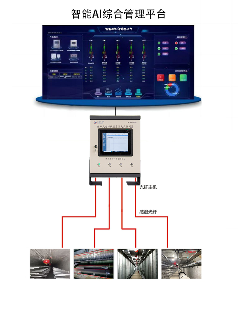 本方案主要運(yùn)用光纖測溫主機(jī)、感溫光纖、監(jiān)控管理軟件及相關(guān)附件,光纖測溫主機(jī)基于的OTDR技術(shù)和Raman散射光對(duì)溫度敏感的特性,結(jié)合高頻脈沖激光、波分復(fù)用、高頻信號(hào)采集及微弱信號(hào)處理等技術(shù),通過將感溫光纖敷設(shè)于電纜及管道表面,以及吊裝在管廊頂部,能完整且系統(tǒng)性的探測光纖沿線所有測量點(diǎn)的溫度,并識(shí)別溫度異常點(diǎn)的具體位置。可實(shí)現(xiàn)幾十公里的溫度連續(xù)測量,沒有遺漏點(diǎn)。一旦管廊內(nèi)某一位置發(fā)生火情,溫度異常,系統(tǒng)可在的時(shí)間內(nèi)捕捉到火情,并將監(jiān)測的溫度數(shù)據(jù)實(shí)時(shí)上傳到智能AI綜合管理平臺(tái),且可以與其他火災(zāi)報(bào)警設(shè)備進(jìn)行聯(lián)動(dòng),保障城市管廊的運(yùn)行。該系統(tǒng)測溫距離長,且具有本征無源、抗電磁干擾、防雷防爆等優(yōu)勢。